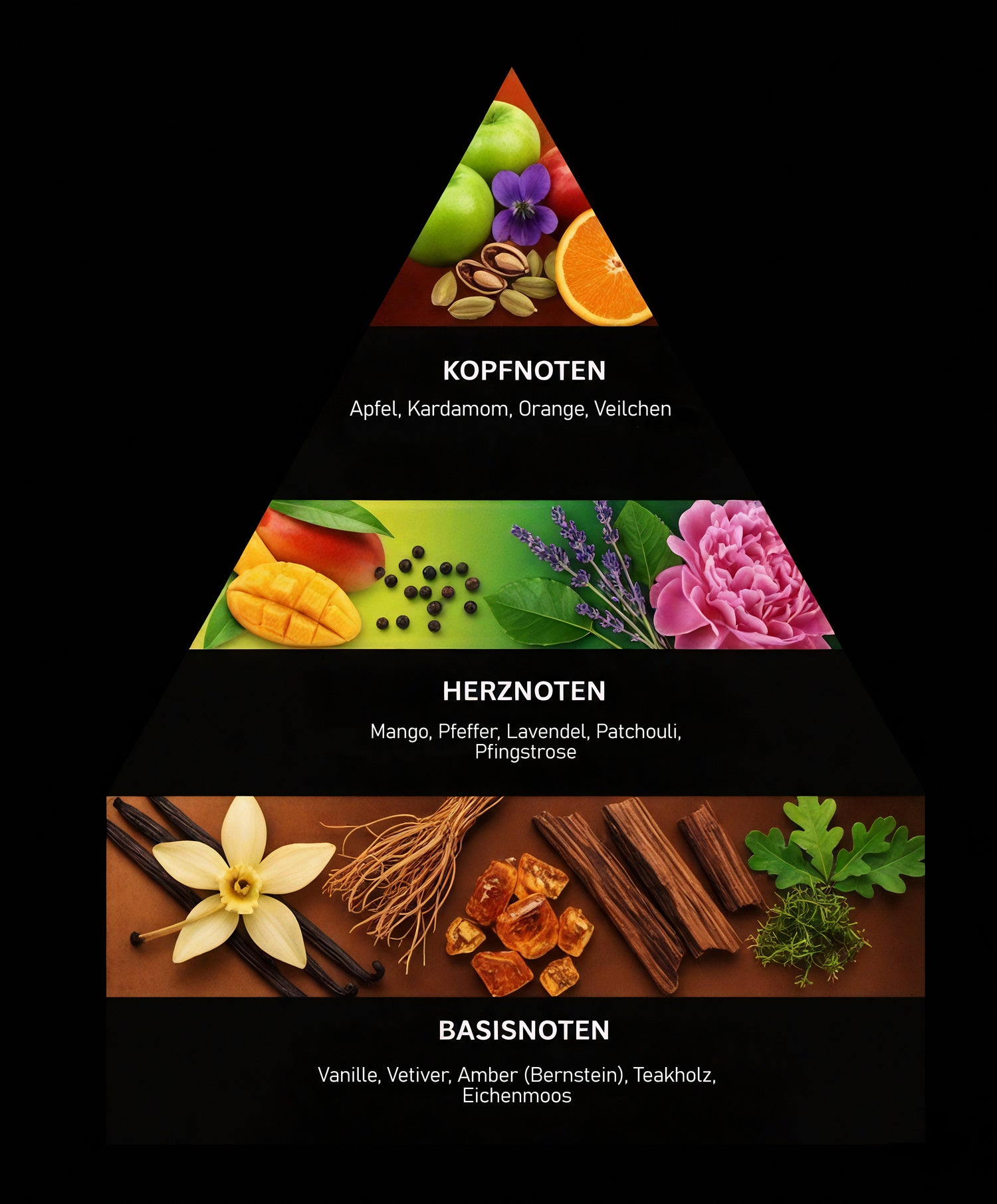 Der Auftakt ist frisch und hell, ohne laut zu sein. Apfel und Kardamom öffnen den Duft klar und modern, während Wärme und Würze langsam Tiefe entstehen lassen. Aus Frische wird Charakter.
